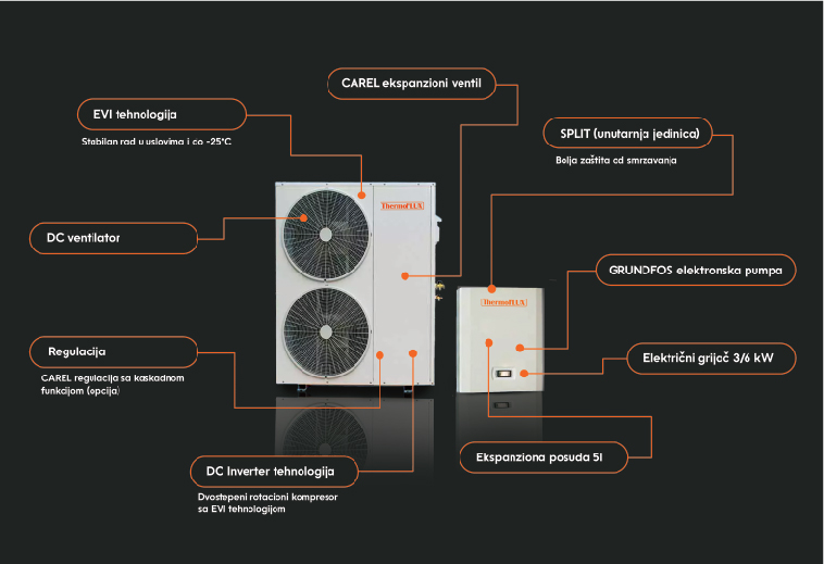 Dvostupanjski rotacijski kompresor radi stabilno na temperaturama do -25°C, a zahvaljujući DC Inverter ventilatorima pumpe rade s niskom razinom buke. Postoji mogućnost Wi-Fi upravljanja putem pametnih telefona, a pametna regulacija s kaskadnom funkcijom daje mogućnost instalacije više toplotnih pumpi u kaskadu i upravljanja s jednog mjesta. Kad uređaju treba odmrzavanje on koristi visokofrekventni rad što smanjuje vrijeme odmrzavanja.